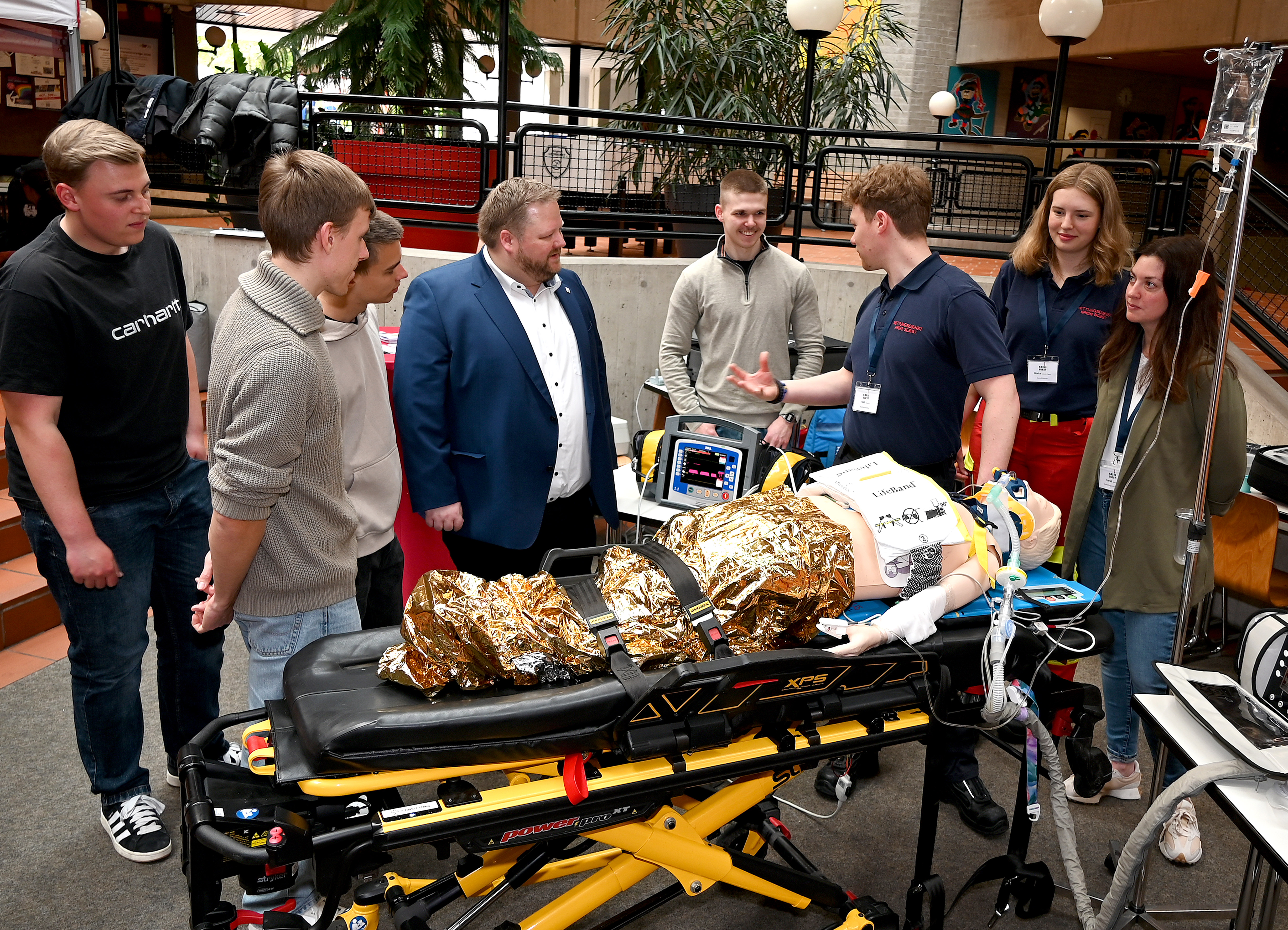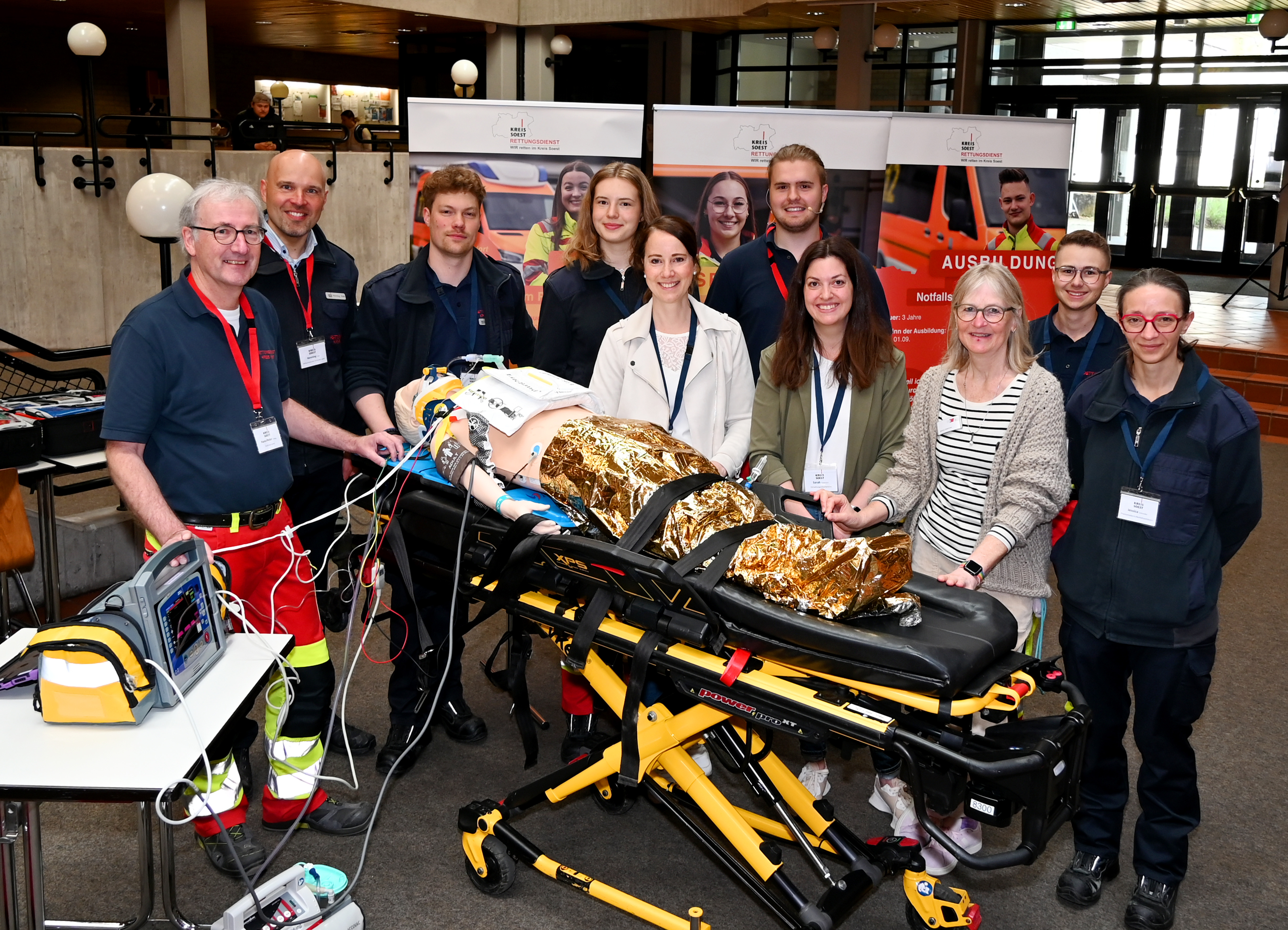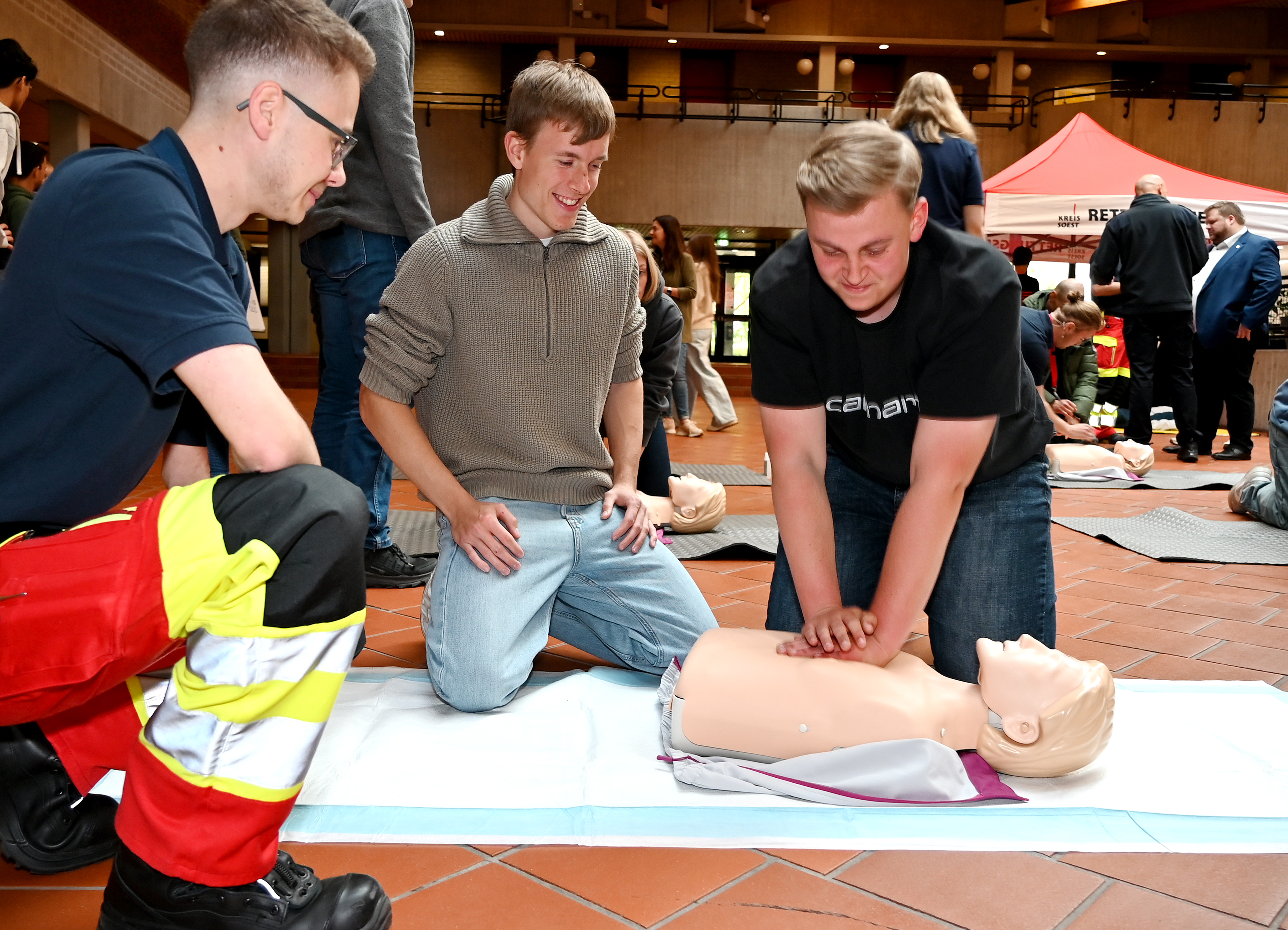 Mit dem Simulations-Rettungswagen macht der Rettungsdienst in dieser Woche Station an allen drei kreiseigenen Berufskollegs. In dem so genannten SIM-RTW werden normalerweise die Nachwuchskräfte im Rettungsdienst möglichst realitätsnah ausgebildet. An den Berufskollegs werden jetzt an verschiedenen Stationen die nötigen Handgriffe gezeigt, um Menschen bei einem Herz-Kreislauf-Stillstand zu helfen. „Wir freuen uns, dass der Auftakt hier bei uns am Börde-Berufskolleg stattfindet“, sagt Bettina Ademmer, Lehrerin am Börde-Berufskolleg und Expertin für Medizinalfachberufe, die die Aktion eng begleitet und gute Chancen sieht, auf diesem Weg zahlreiche weitere motivierte Ersthelfer zu gewinnen. Am Mittwoch, 29. April, findet die Aktion am Lippe-Berufskolleg in Lippstadt und am Donnerstag, 30. April, am Hubertus-Schwartz-Berufskolleg in Soest statt.