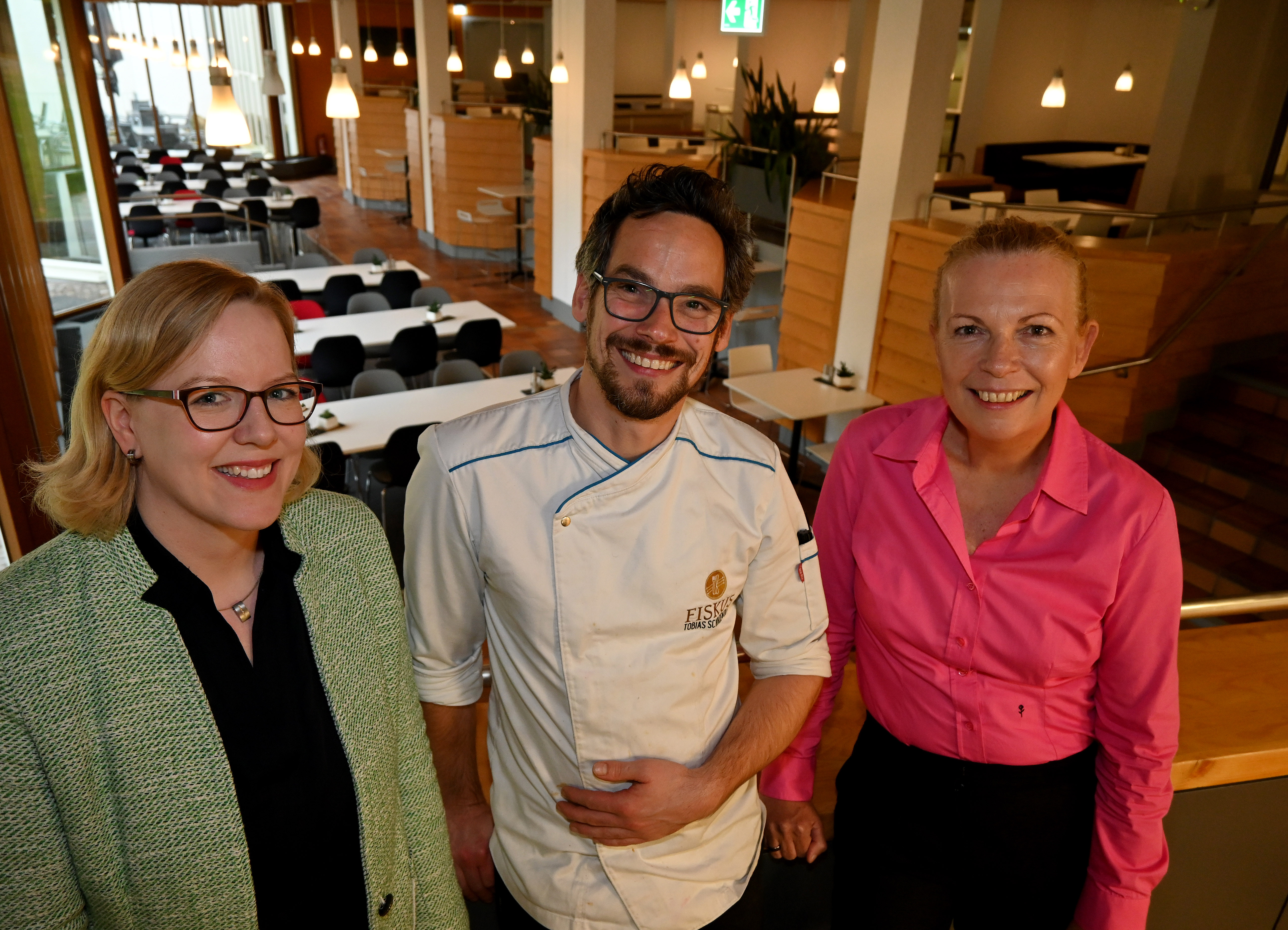 Tobias Schindewolf freut sich auf den Start im Kreishaus. „Wir kochen nicht nur das übliche Kantinenessen, sondern zaubern täglich einen bunten Mix aus den Klassikern der Kantine, inspiriert von der internationalen Küche und vegetarischen Gerichten und schöpfen dabei aus allem, was die Welt an Geschmack zu bieten hat“, kündigt der Koch und Küchenmeister an. Sein vierköpfiges Team – darunter ein Auszubildender – und er haben den Anspruch, die Besucherinnen und Besucher jeden Tag mit frischen, abwechslungsreichen und hochwertigen Speisen zu begeistern. Verarbeitet werden dafür vorrangig regionale und saisonale Lebensmittel.