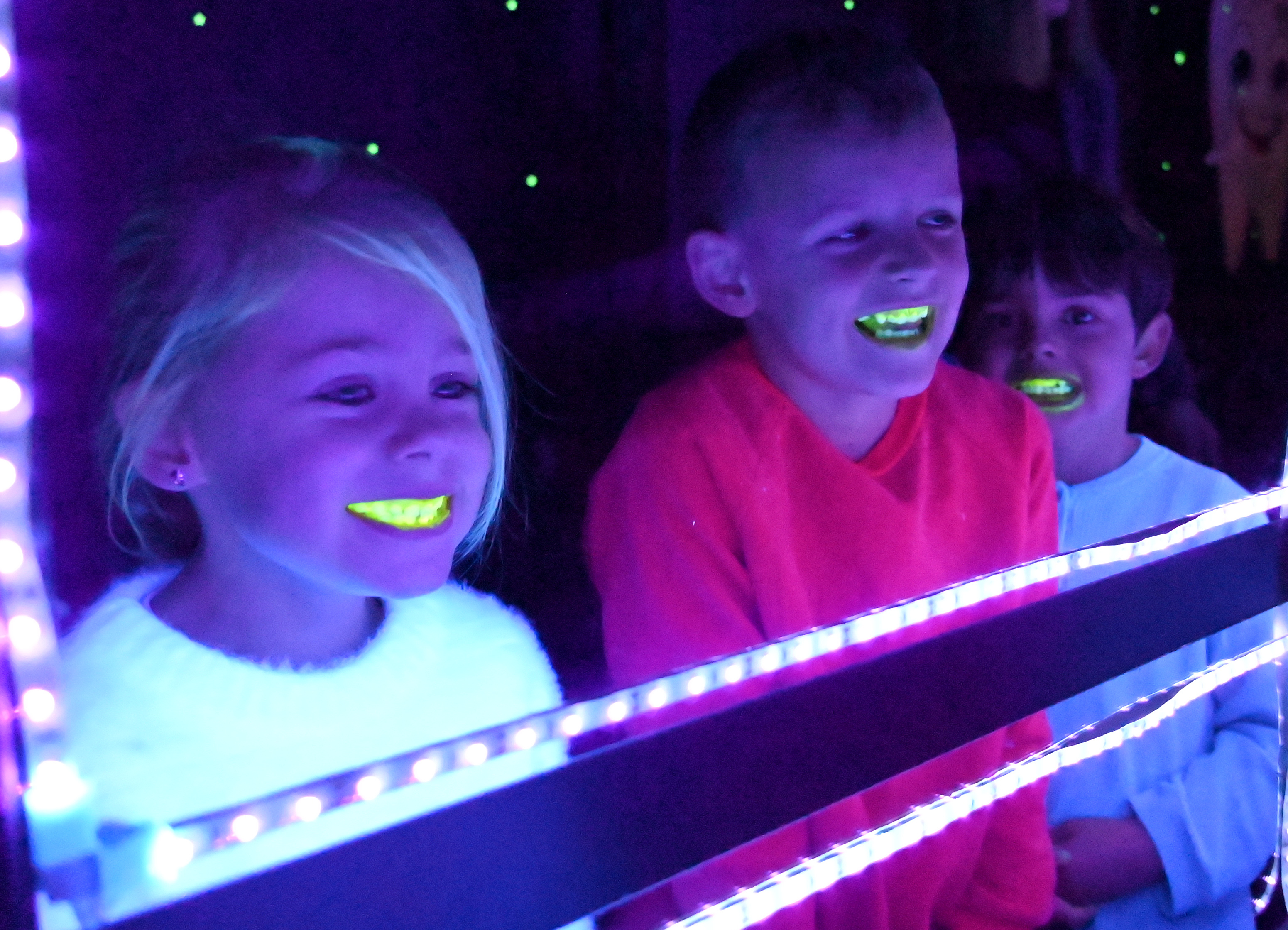 Bevor die Kinder in den mit Schwarzlicht beleuchteten Tunnel gehen, färben Mitarbeiterinnen des Arbeitskreises die Zähne mit einer fluoreszierenden Flüssigkeit. So werden im Kariestunnel hartnäckige Zahnbeläge sichtbar und erscheinen im Spiegel in leuchtendem Gelb. „Für die Kinder ist das sehr wichtig. Sie müssen Zahnbeläge sehen, um zu verstehen, warum gründliches Putzen notwendig ist“, erklärt Heike Prünte vom Zahnärztlichen Dienst. Anschließend dürfen die Kinder unter fachkundiger Anleitung die Beläge an einem sogenannten Putzbrunnen wegbürsten. Nach der Putzaktion können die Zähne bei einem erneuten Gang durch den Tunnel kontrolliert werden. Hier zeigt sich der Erfolg: Ein strahlendes Gebiss ohne Beläge.