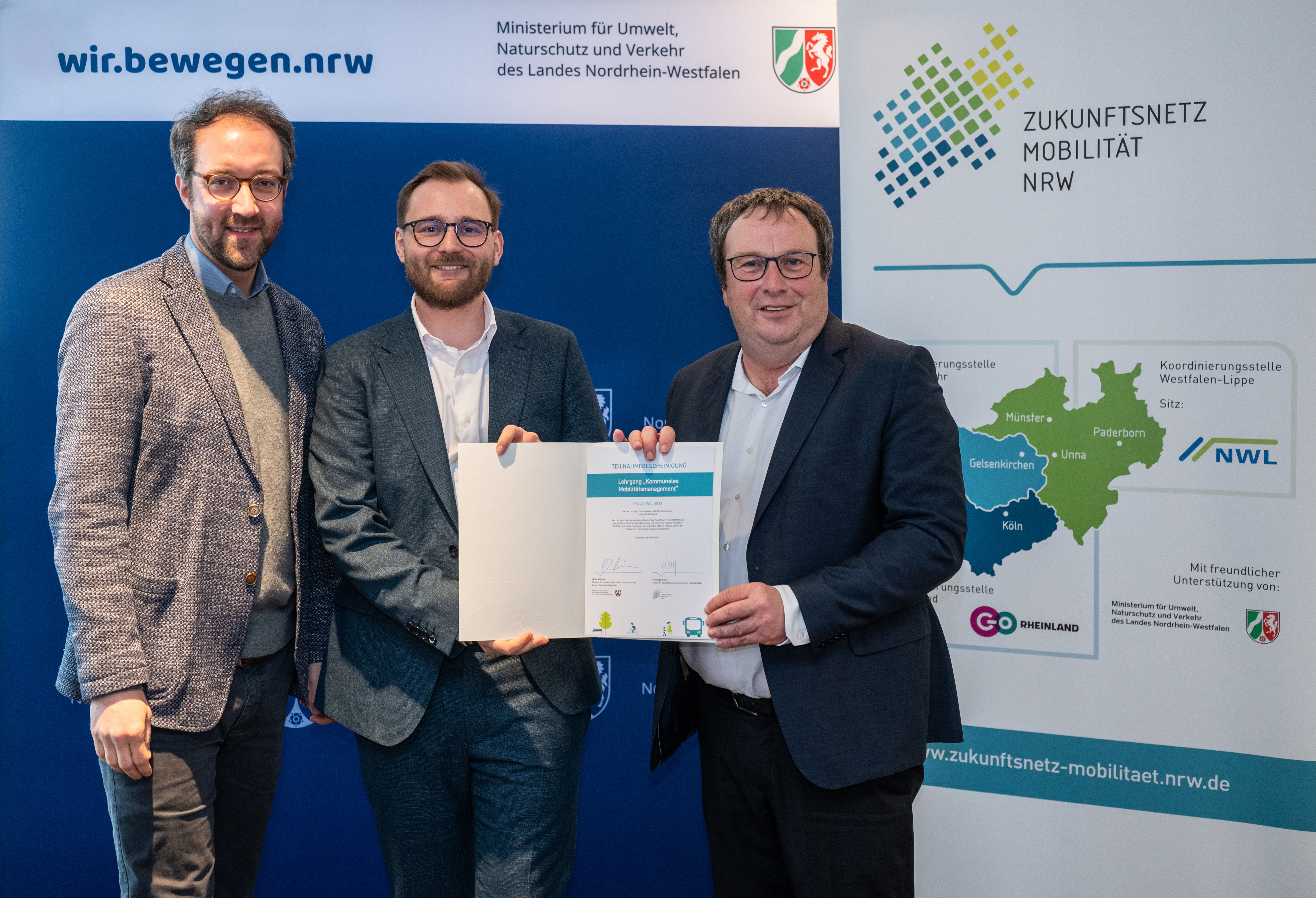 Nach dem erfolgreichen Abschluss eines mehrstufigen Lehrgangs des Zukunftsnetzes Mobilität NRW erhielt Pascal Wollnitza als Vertreter des Kreises Soest in Düsseldorf eine Urkunde von Oliver Krischer, Minister für Umwelt, Naturschutz und Verkehr des Landes Nordrhein-Westfalen. Der Kreis Soest ist seit 2016 Mitglied im Zukunftsnetz Mobilität NRW.